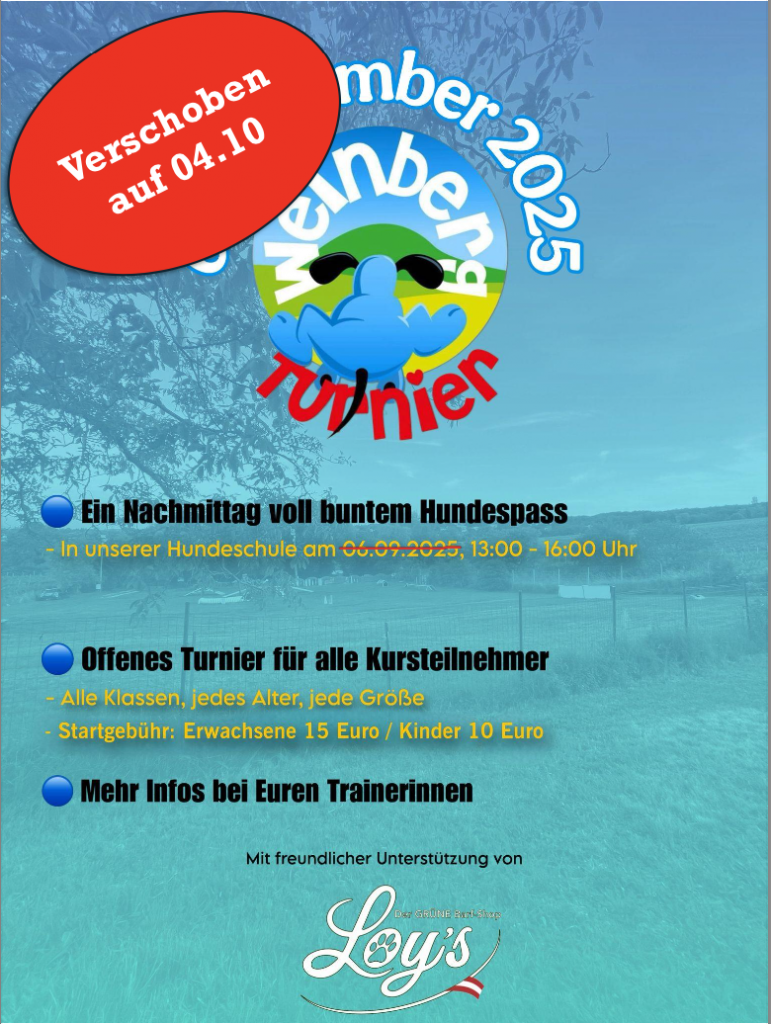wir laden euch herzlich zu unserem Weinbergturnier am 07. September 2024 von 13 bis 16 Uhr in unserer Hundeschule ein! Freut euch auf einen schönen Nachmittag voller Hundespaß und gemeinsamer Aktivitäten.